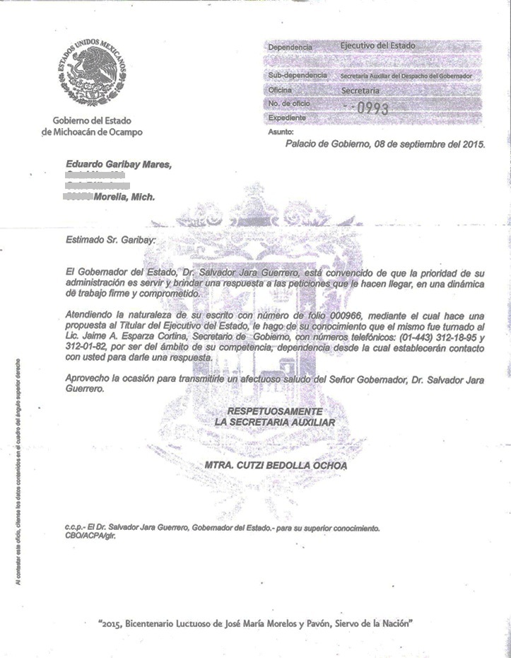 Recibida la Propuesta de Capacitación Educativa para la Asistencia Nacional por escrito en este 2015: por el Rector de la Universidad Michoacana de San Nicolás de Hidalgo, Medardo Serna González, el 23 de septiembre; por el Presidente Constitucional de los Estados Unidos Mexicanos, Enrique Peña Nieto, el 24 de septiembre; y por el Gobernador Constitucional del Estado Libre y Soberano de Michoacán de Ocampo, Silvano Aureoles Conejo, el 1 de octubre, presentada en documento de 9 páginas por quien esto escribe, periodista e historiador michoacano, Fundador y Coordinador General del Comité de Egresados y Estudiantes de Historia para la Asistencia Social, CEEHAS, y Máximo Promedio de la Generación 1996-2000 en la Escuela de Historia de la Universidad Michoacana de San Nicolás de Hidalgo, en la que respetuosamente y atentamente a las mencionadas autoridades asimismo les SOLICITA: