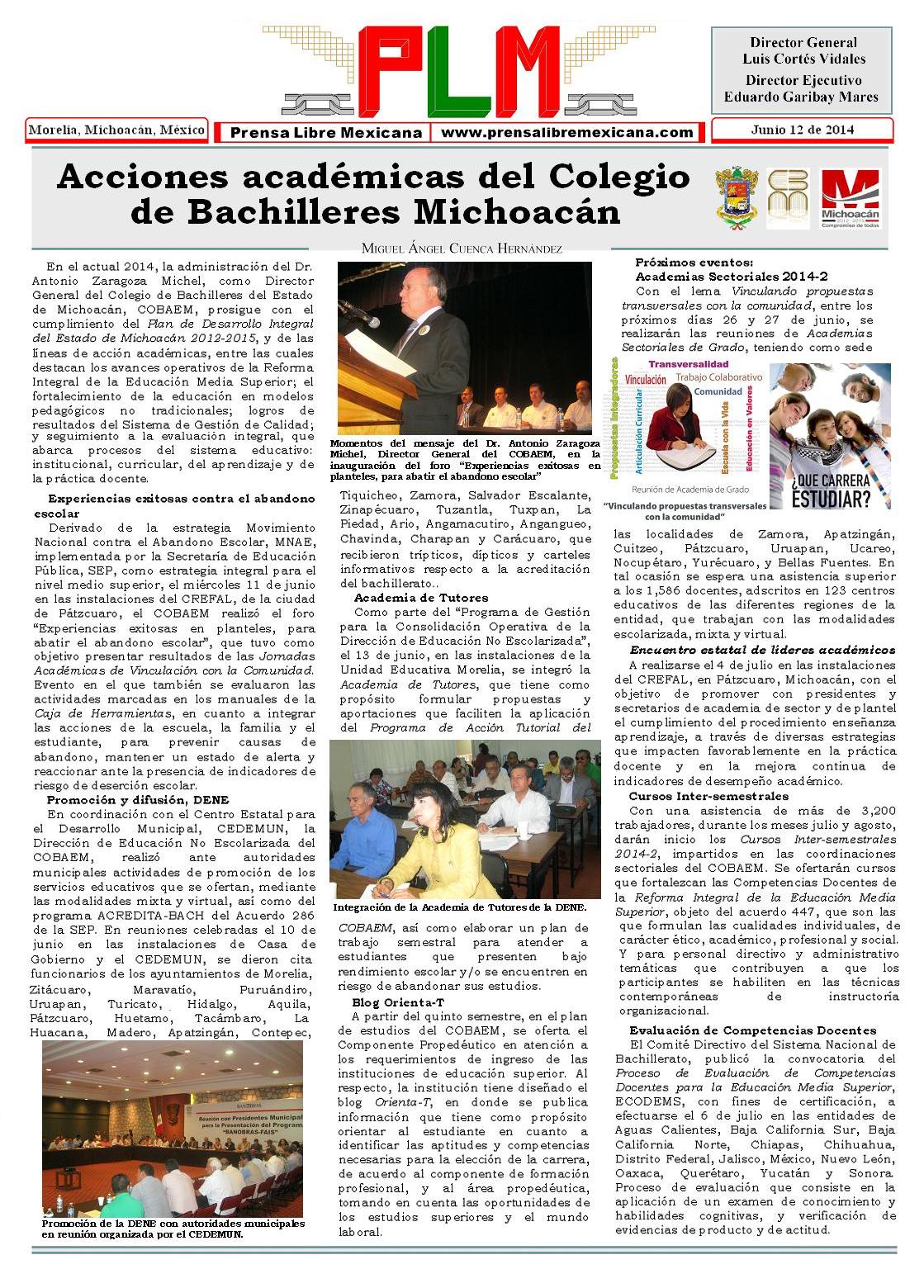 En el actual 2014, la administración del Dr. Antonio Zaragoza Michel, como Director General del Colegio de Bachilleres del Estado de Michoacán, COBAEM, prosigue con el cumplimiento del Plan de Desarrollo Integral del Estado de Michoacán 2012-2015, y de las líneas de acción académicas, entre las cuales destacan los avances operativos de la Reforma Integral de la Educación Media Superior; el fortalecimiento de la educación en modelos pedagógicos no tradicionales; logros de resultados del Sistema de Gestión de Calidad; y seguimiento a la evaluación integral, que abarca procesos del sistema educativo: institucional, curricular, del aprendizaje y de la práctica docente.